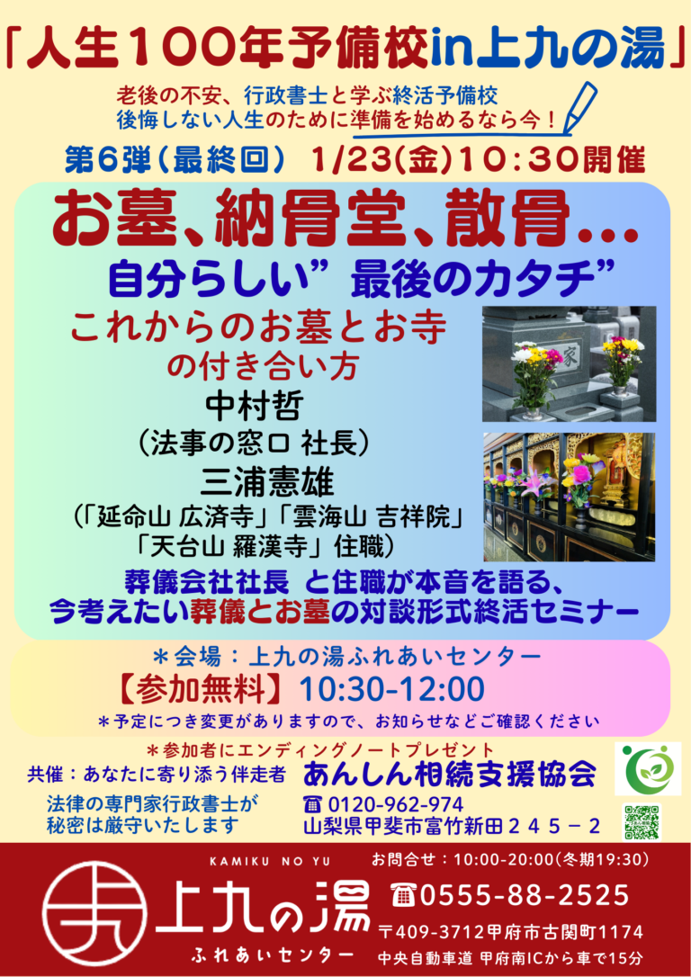 人生100年予備校in上九の湯「お墓、納骨堂、散骨、自分らしい最後のカタチ」